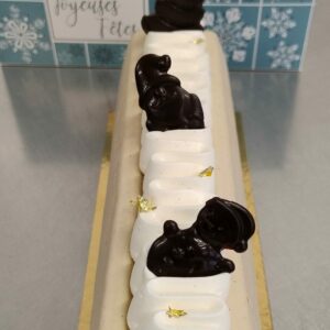 Base de biscuit moelleux avec son insert à la poire vanillée le tout dans une mousse au chocolat noir