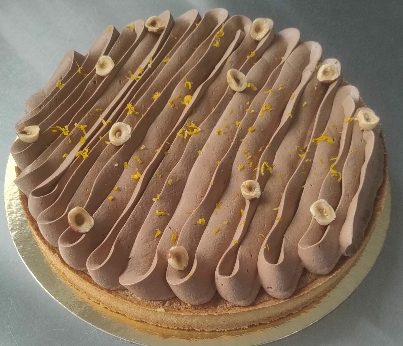 Une pâte sucrée garnie de crème à la noisette et de suprêmes d’orange, surmontée d’une ganache montée au chocolat noir.