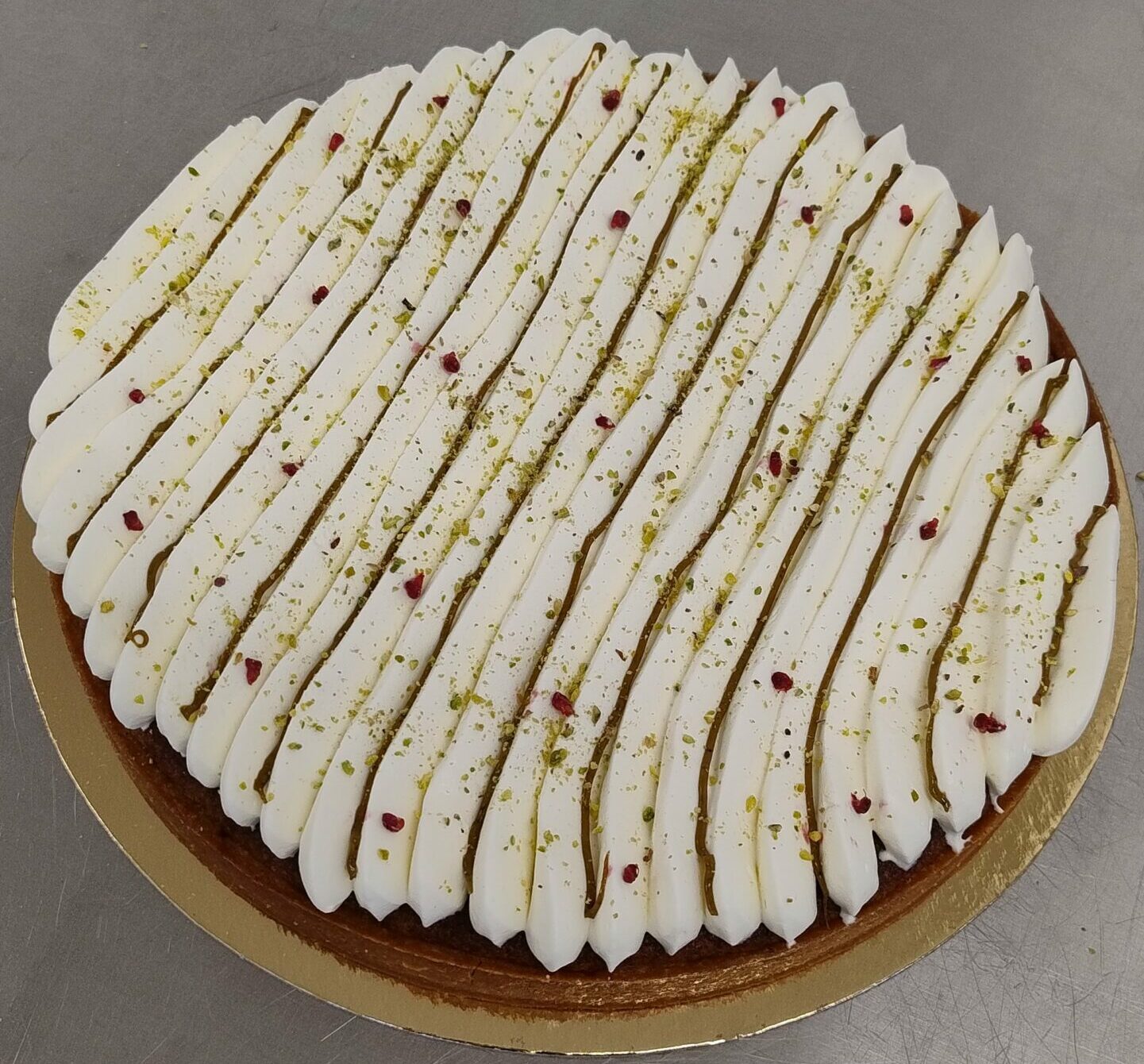 Une pâte sucrée garnie d’une crème amande-pistache et de framboises entières, surmontée d’une crème légère à la fleur d’oranger.